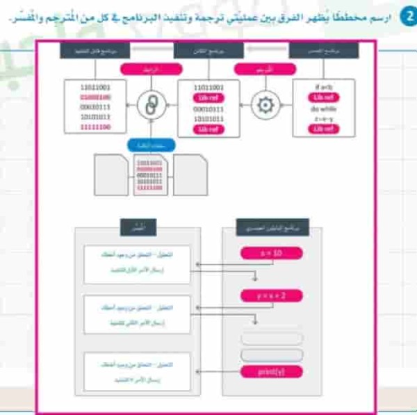 ارسم مخططا يظهر الفرق بين عمليتي ترجمة وتنفيذ البرنامج في كل من المترجم والمفسر: